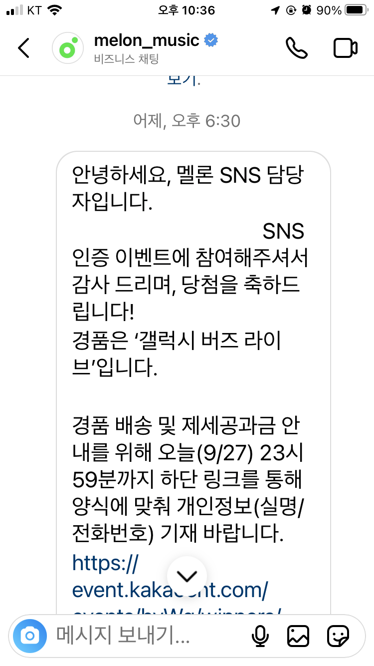 오늘 인스타에 들어가니 갤럭시 버즈 당첨되었다는 DM이 와 있어서..