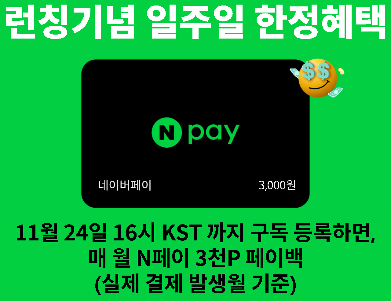 11월 24일까지 구독하면 매 월 네이버페이로 3000원씩 페이백을 해준다고 하네요.