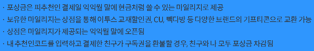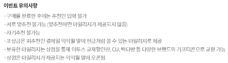 이벤트 유의사항 ·구매를 완료한 후에는 추천인 입력 불가 ·서로 맞추천 불가능 (맞추천하면 마일리지가 제공되지 않음) ·자기추천 불가능 ·포상금은 피추천인 결제일 익익월 말에 현금처럼
