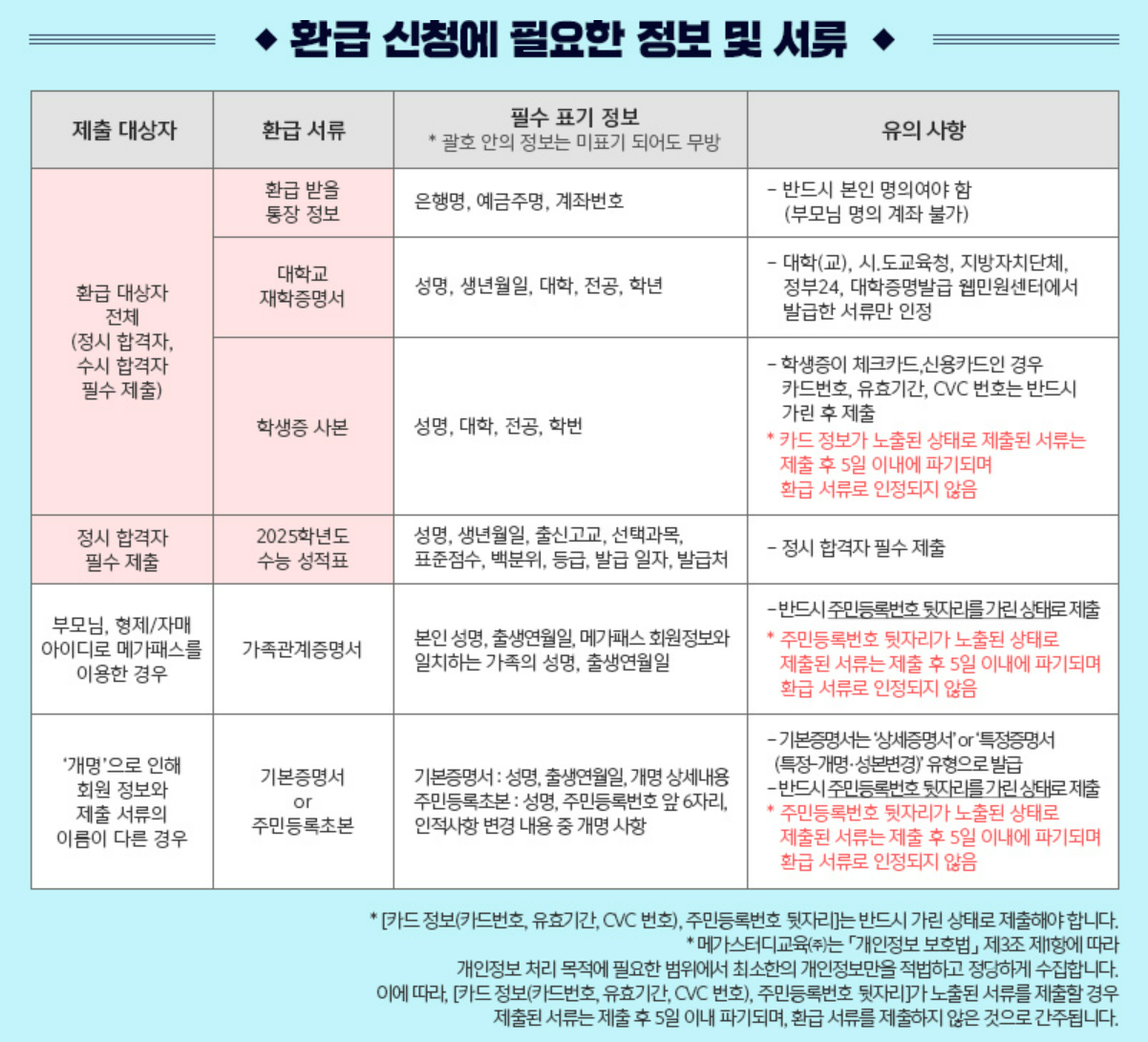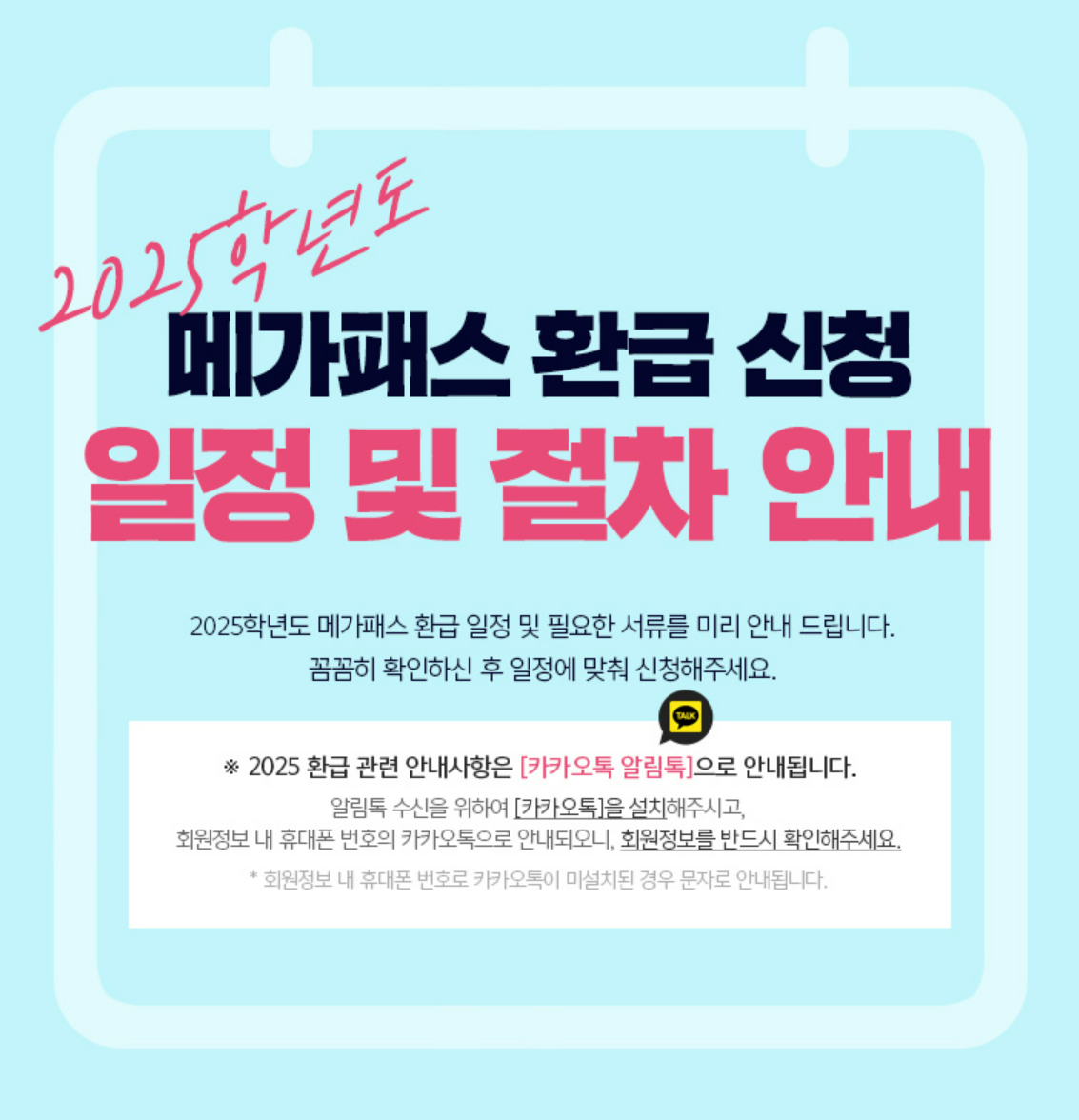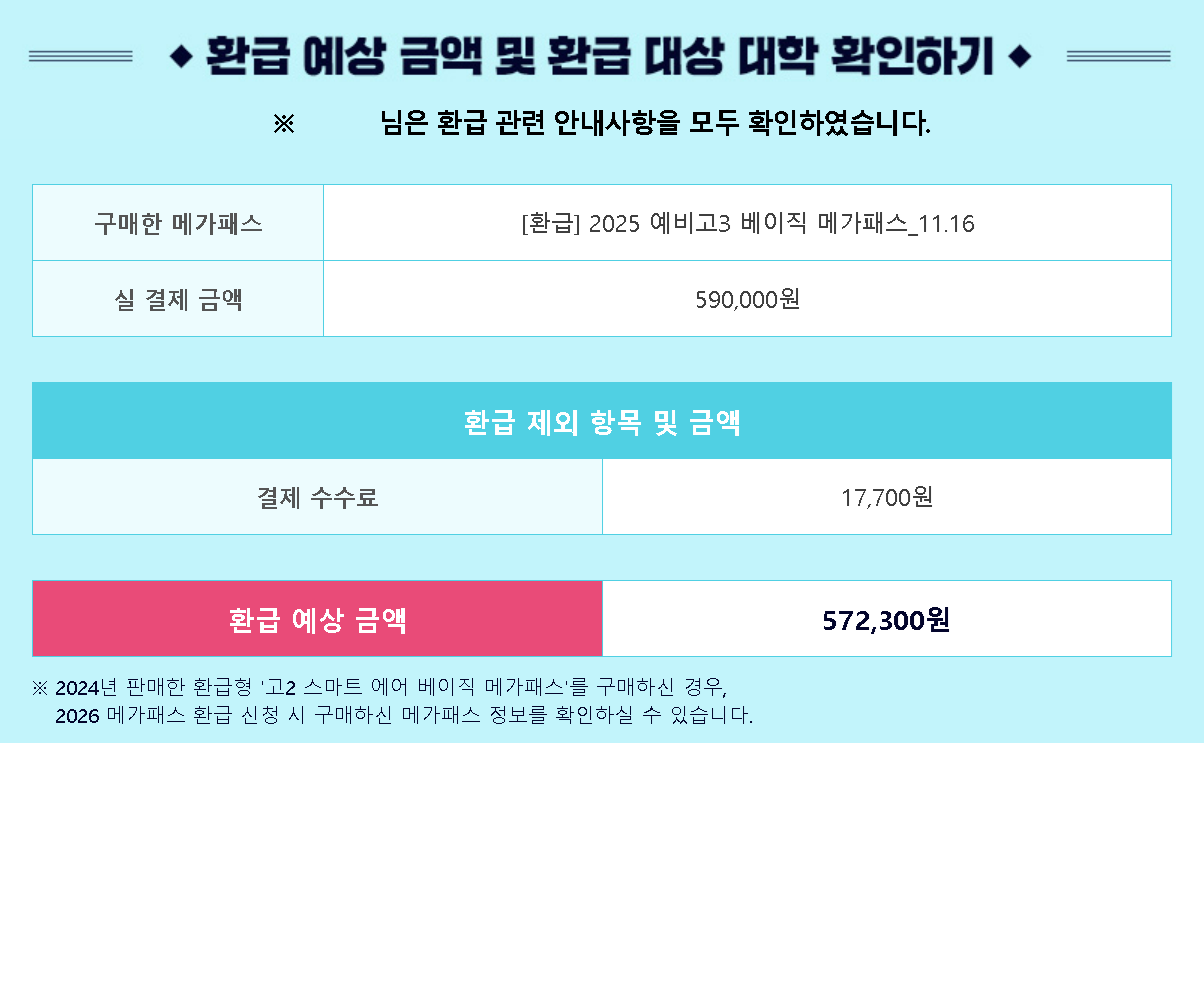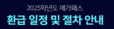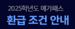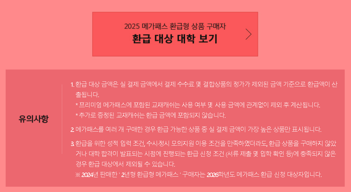 - 환급형 2025 메가패스 구매 시기에 따라 환급 대상 대학이 다릅니다. 상품 구매 전 반드시 구매 시점의 환급 대상 대학 목록을 확인하세요.