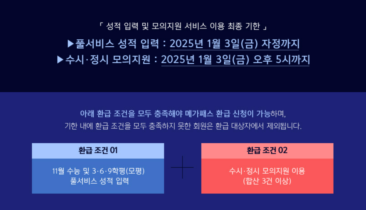 * 위 2가지 조건을 모두 충족해야 메가패스 환급 최종 대상자로 선정됩니다. 환급 대상자로 선정되신 후 환급 신청 기간 내에 관련 서류를 모두 제출하고, 환급 대상 대학 최종 입학 확인 및 각 대학별 장학금 지급 시기까지 재학 상태임이 확인되어야 환급형 장학금이 지급됩니다. [2025 메가패스 환급 조건 ① - 풀서비스 성적 입력]