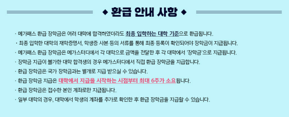 - 환급형 장학금은 메가패스 결제 정보에 입력된 회원 본인만 받을 수 있으며, 환급형 장학금 대상 메가패스를 여러 개 구매했더라도 주민등록번호 기준으로 1인 1회만 지급됩니다. (*구매한 환급형 장학금 대상 상품 중 최대 환급형 장학금 금액으로 지급)