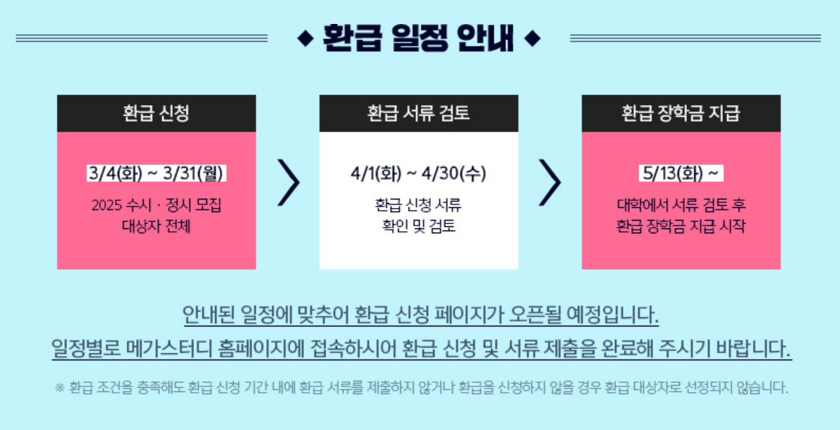 - 환급형 장학금 지급 절차 및 일정은 개별적으로 고지하지 않으며, 장학금 신청 시기에 메가스터디 홈페이지를 통해 별도 안내될 예정이오니 시기별로 메가스터디 홈페이지를 통해 확인해 주시기 바랍니다.