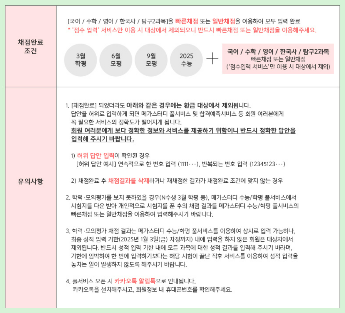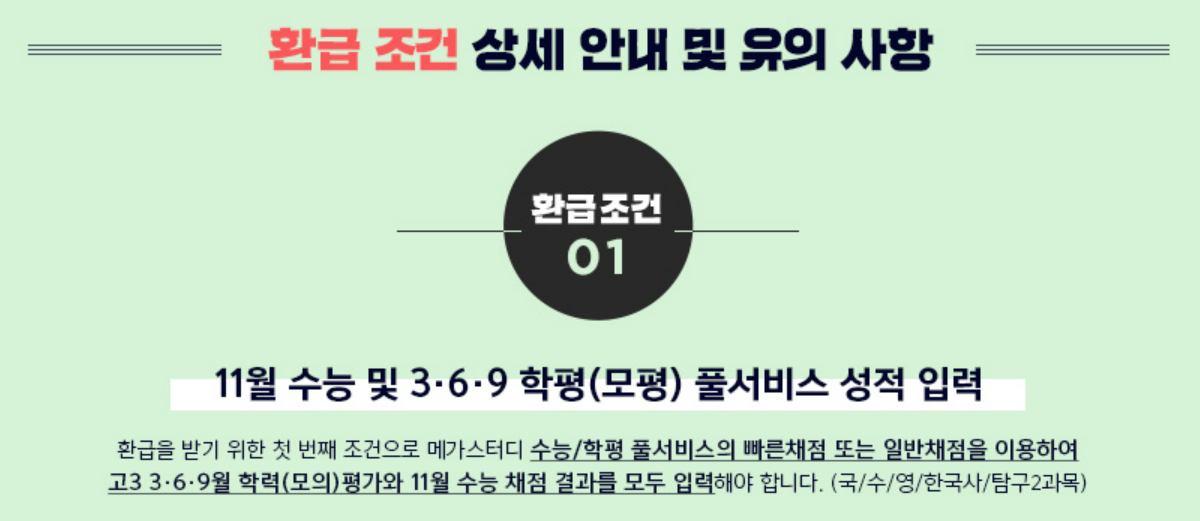 * 고1·2 내신 환급 신청 시기는 추후 메가스터디 홈페이지를 통해 별도 안내됩니다. (2025년 1월 중 오픈 예정)