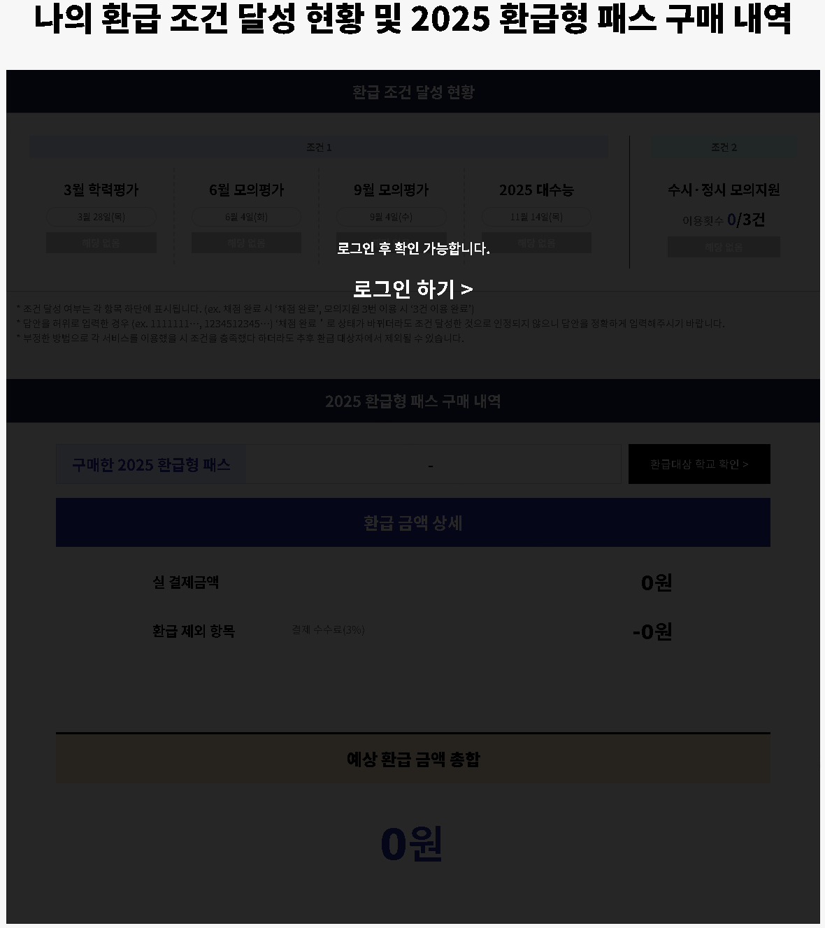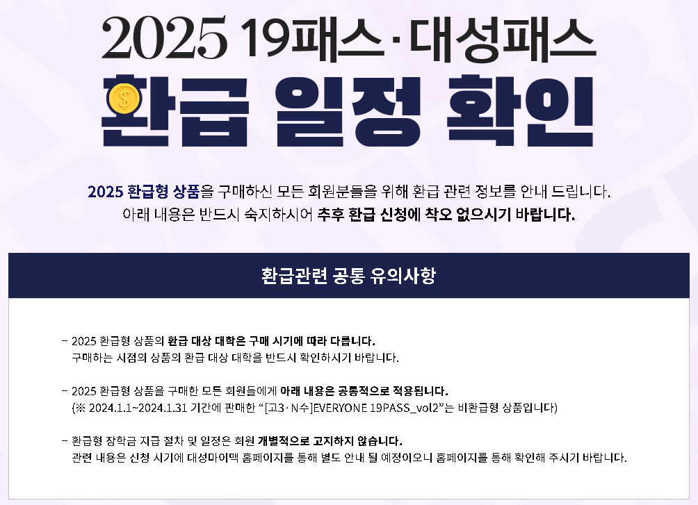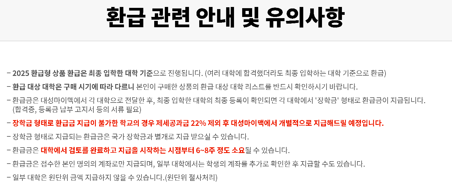 2025 환급형 상품을 구매하신 모든 회원분들을 위해 환급 관련 정보를 안내 드립니다. 아래 내용은 반드시 숙지하시어 추후 환급 신청에 착오 없으시기 바랍니다. 환급관련 공통 유의사항 2025 환