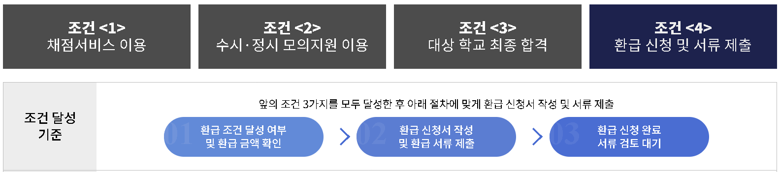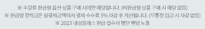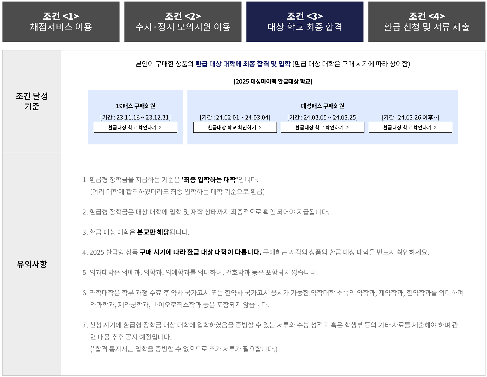 * 환급 대상 대학은 본교만 해당됩니다.- * 대성패스 환급형 상품 구매 시기에 따라 환급 대상 대학이 다릅니다. 구매하는 시점의 상품의 환급 대상 대학을 반드시 확인하세요.
