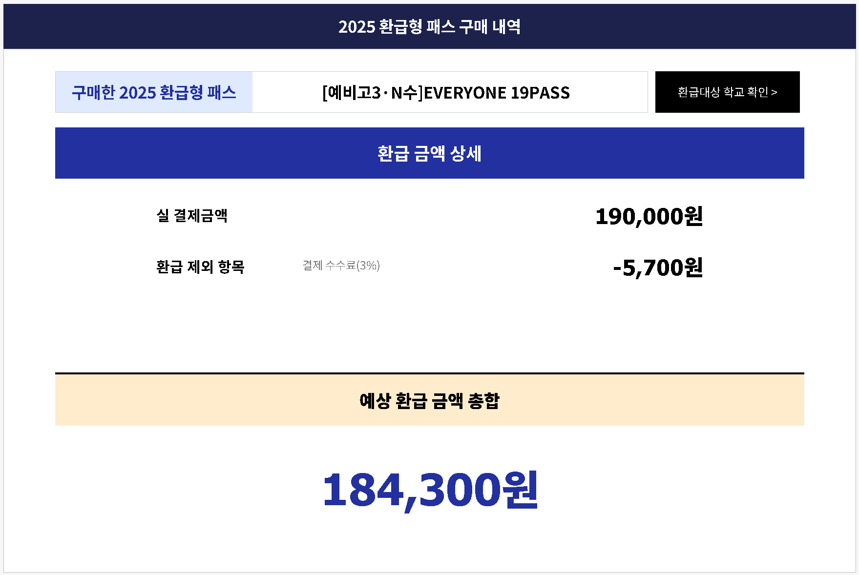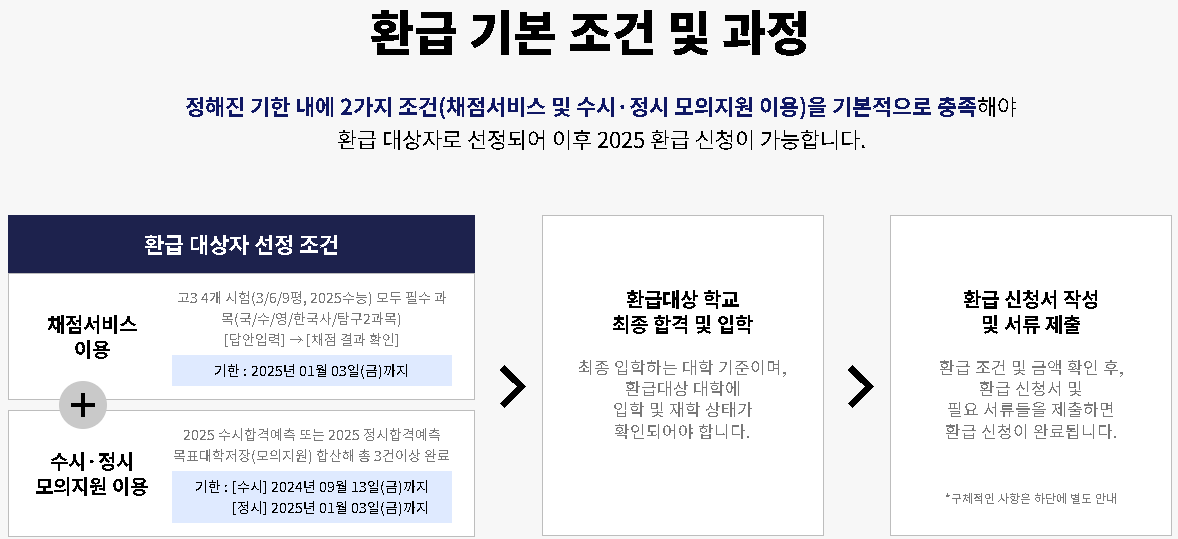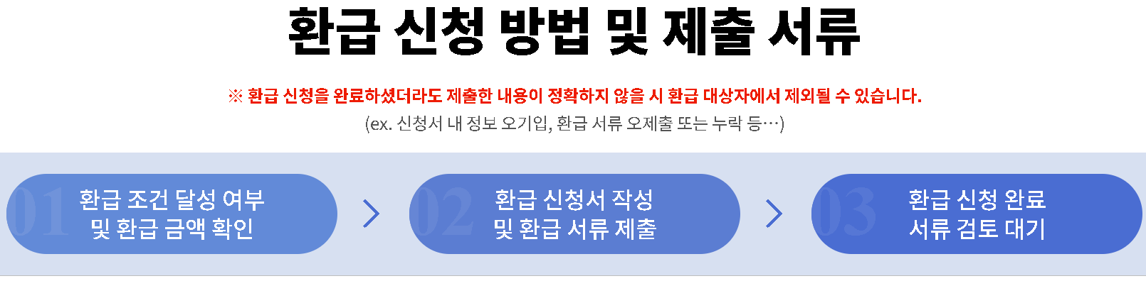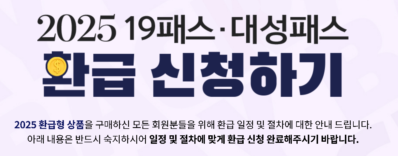 2025 환급형 상품을 구매하신 모든 회원분들을 위해 환급 일정 및 절차에 대한 안내 드립니다. 아래 내용은 반드시 숙지하시어 일정 및 절차에 맞게 환급 신청 완료해주시기 바랍니다. 환급 일정