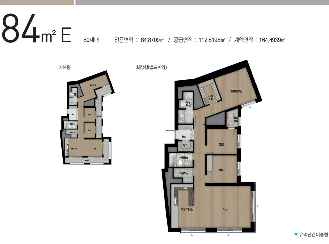 84B는 오션뷰는 거실 주방쪽만 나오는 평면이지만,