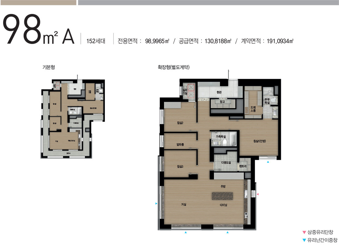 98D는 108동 1,6호 라인으로 다이닝과 거실 맞통창이 좋은 구조입니다.