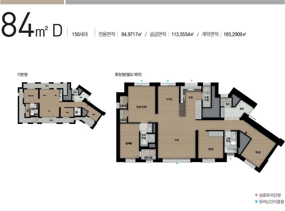 대신 방과 거실 모두 남동, 남서향 배치로 향이 좋은 타입입니다.