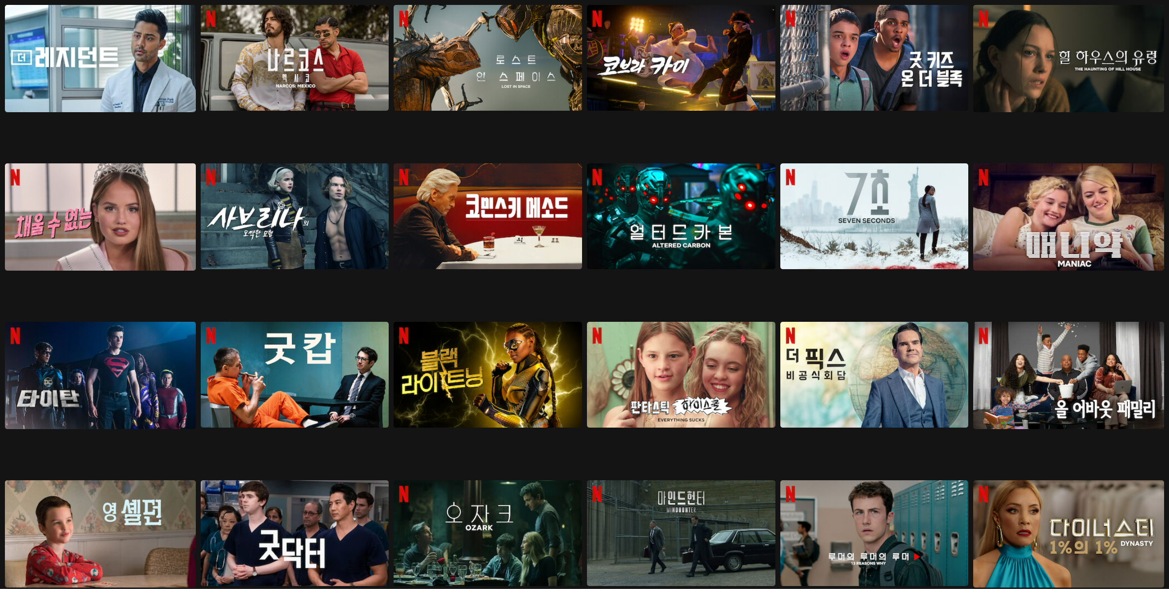더 레지던트, 나르코스: 멕시코, 로스트 인 스페이스, 코브라 카이, 굿키즈 온 더 블록, 힐 하우스의 유령, 채울 수 없는, 사브리나의 오싹한 모험, 코민스키 메소드, 얼터드 카본, 7초, 매니악, DC 타이탄, 굿 캅, 블랙 라이트닝, 판타스틱 하이스쿨, 더 픽스: 비공식회담, 올 어바웃 패밀리, 영 셸던, 굿 닥터, 오자크, 마인드헌터, 루머의 루머의 루머, 다이너스티: 1%의 1%