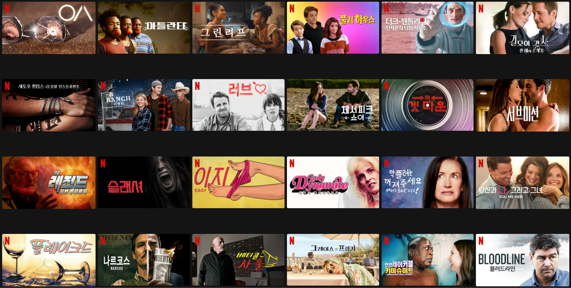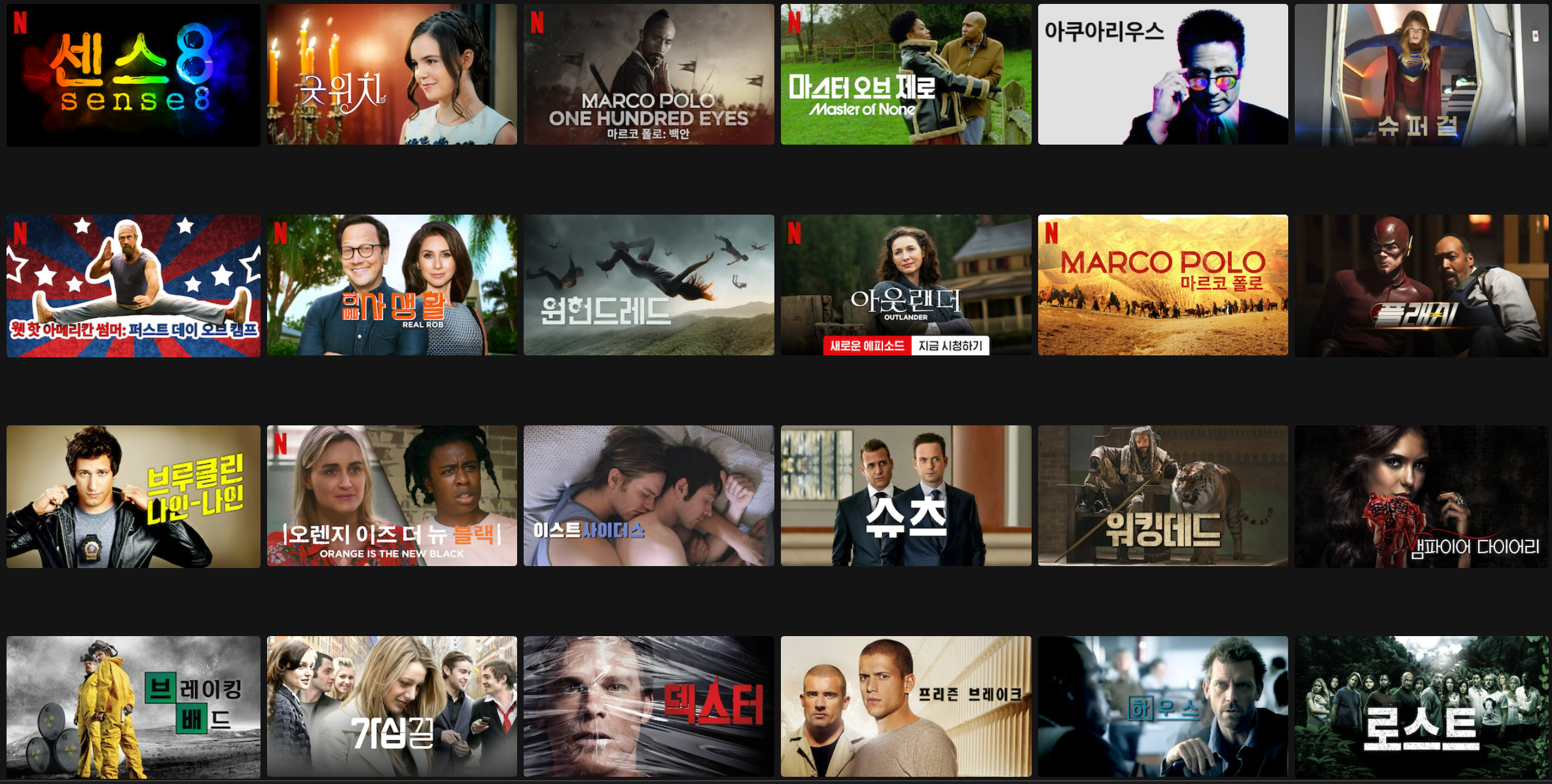 센스8, 굿 위치, 마르코 폴로: 백안, 마스터 오브 제로, 아쿠아리우스, 슈퍼걸, 웻 핫 아메리칸 썸머: 퍼스트 데이 오브 캠프, 롭의 사생활, 원헌드레드, 아웃랜더, 마르코 폴로, 플래시, 브루클린 나인-나인, 오렌지 이즈 더 뉴 블랙, 이스트사이더스, 슈츠, 워킹데드, 뱀파이어 다이어리, 브레이킹 배드, 가십걸, 덱스터, 프리즌 브레이크, 하우스, 로스트