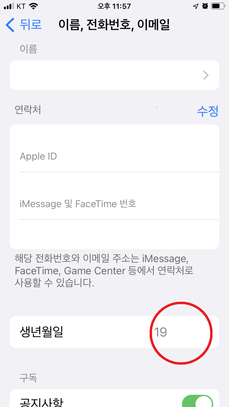 생년월일을 선택해서 만14세 미만으로 생년월일을 재설정합니다.