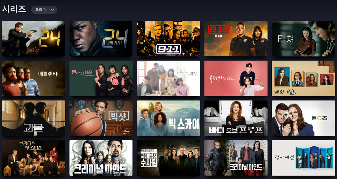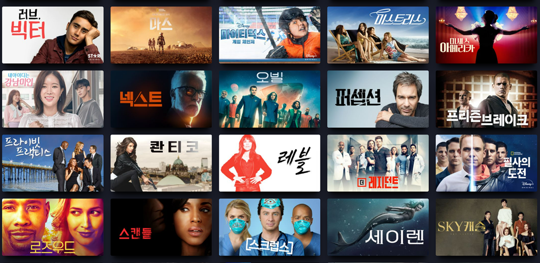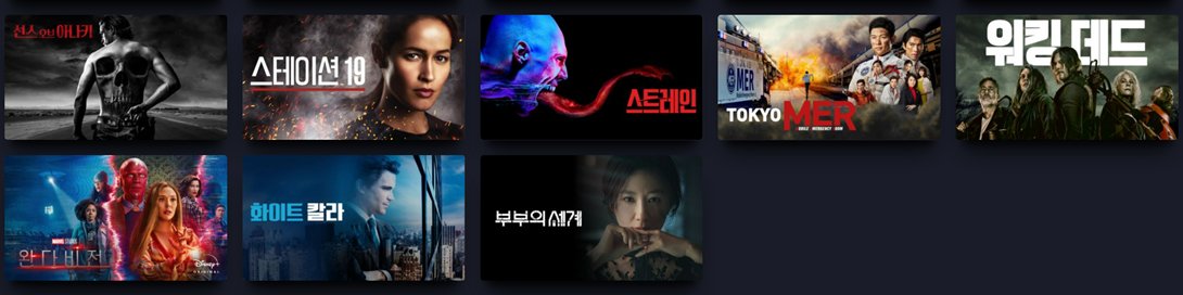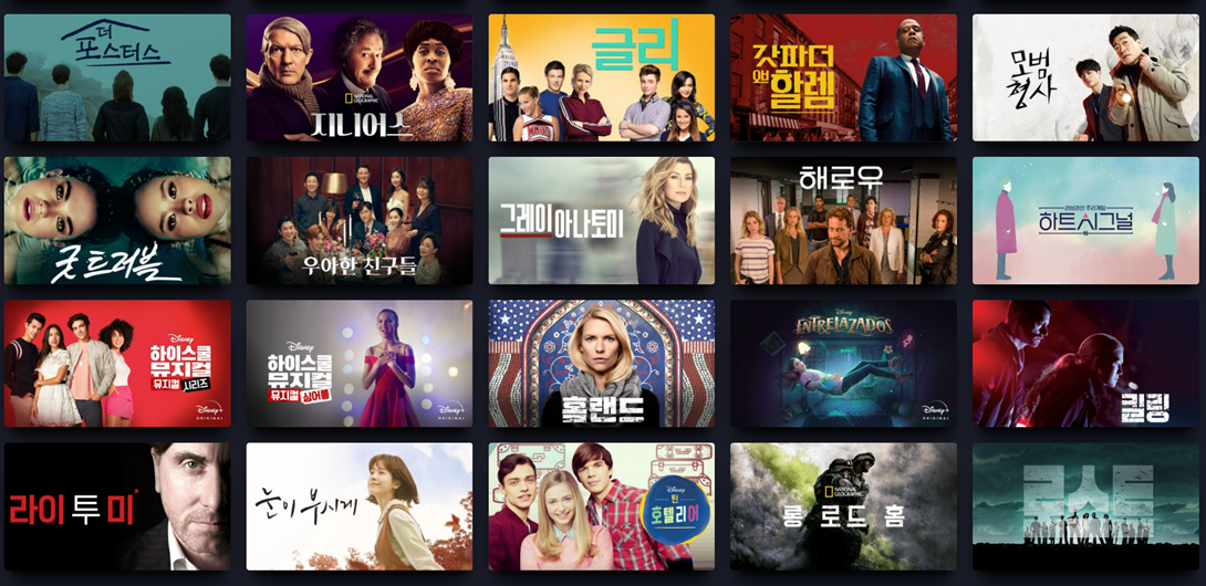 국가별로 카테고리화 되어있는 넷플릭스와는 다르게 디즈니 플러스는 장르별로 묶여있네요.