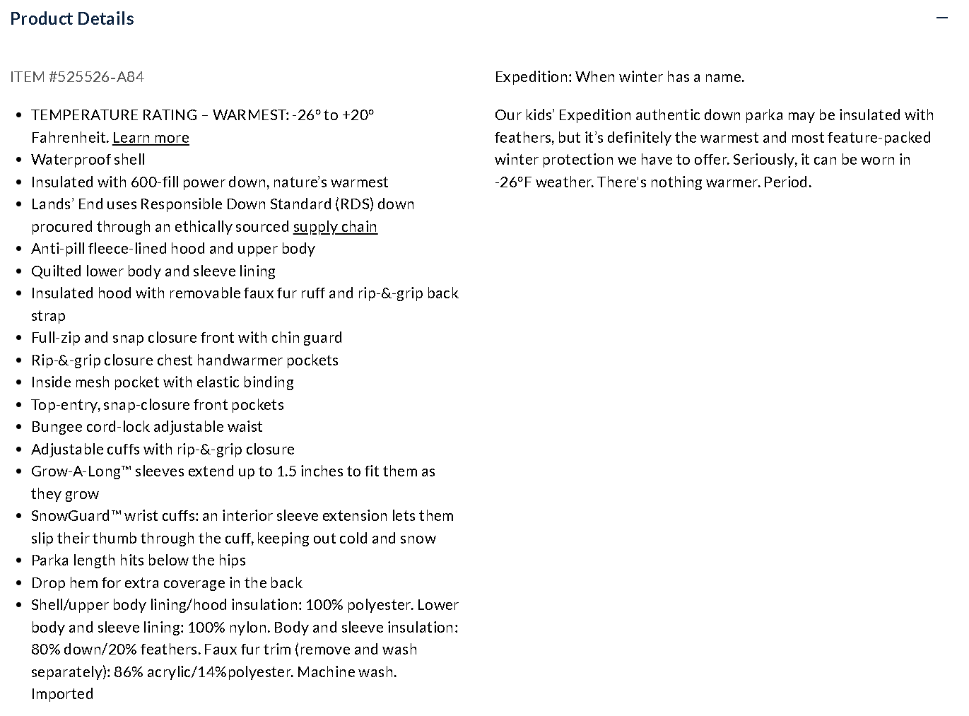 Expedition: When winter has a name. Our kids’ Expedition authentic down parka may be insulated with feathers, but it’s definitely the warmest and most feature-packed winter protection we have to offer. Seriously, it can be worn in -26°F weather. There